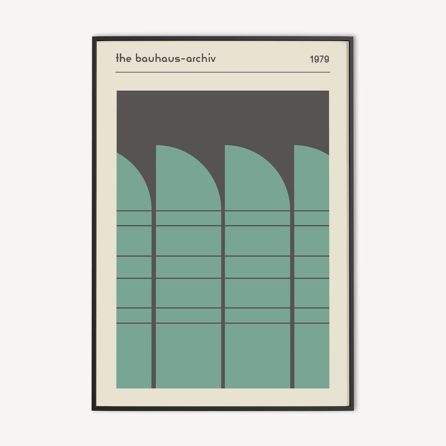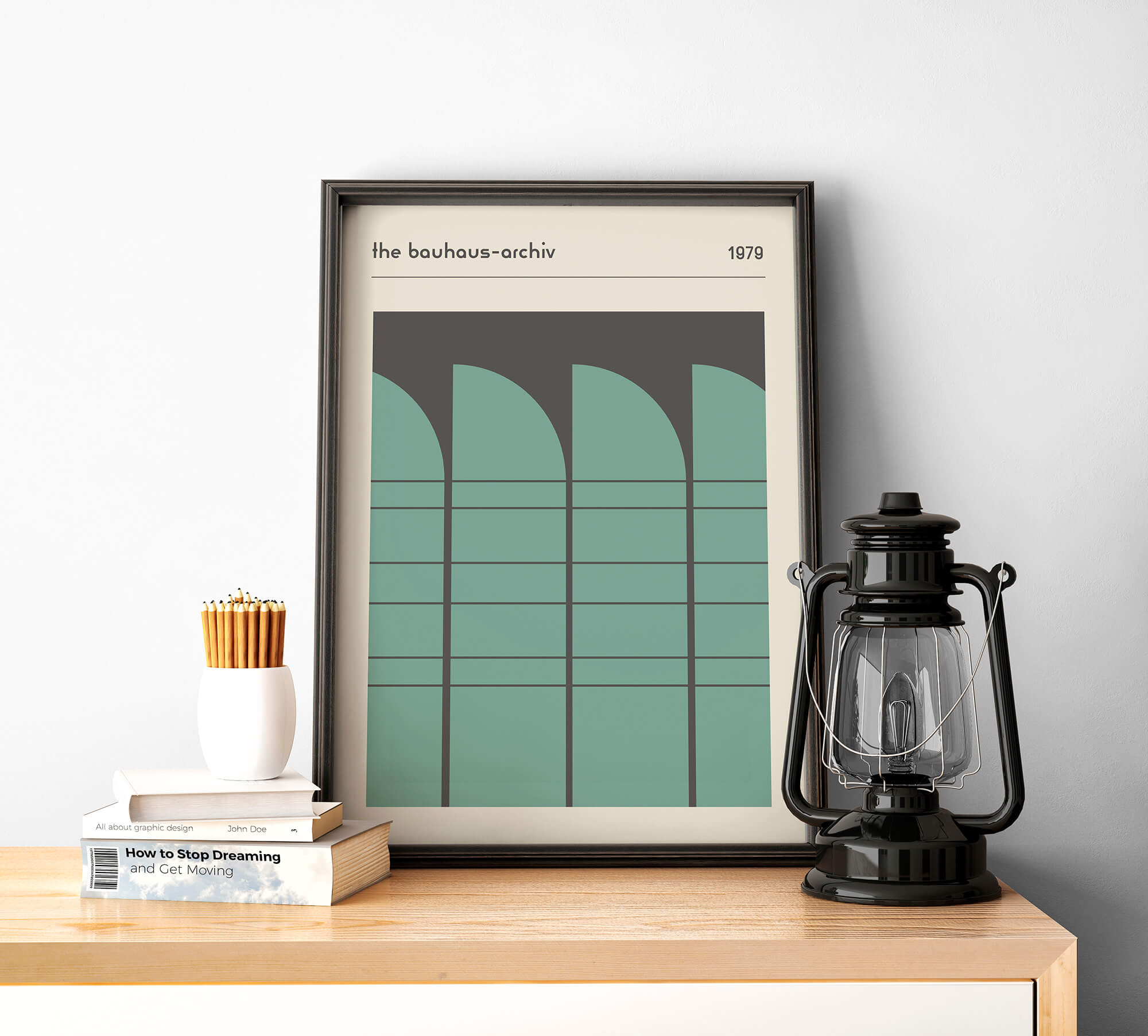 Voor deze Bauhaus geïnspireerde poster heb ik gekozen voor groen in een kader met een donkergrijze achtergrond. De achtergrond van de poster zelf is beige. Een sfeervolle, minimalistische poster en canvas print voor liefhebbers van kunst, architectuur en design.